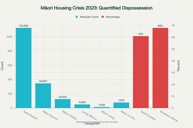 Over 34,500 Māori experience severe housing deprivation in 2023, with 61% of all homeless people being Māori despite representing only 17% of the population.