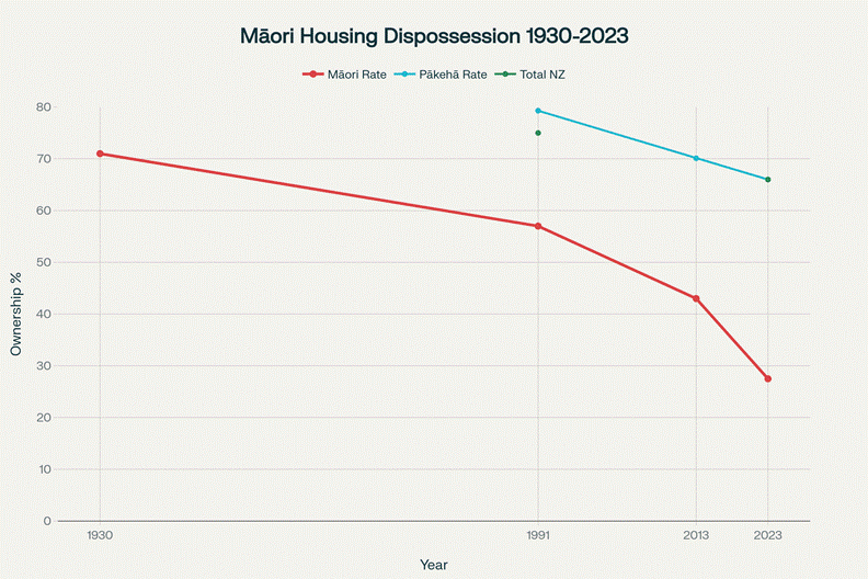 Māori home ownership has plummeted from 71% in the 1930s to just 27.5% in 2023, a devastating 61.3% decline driven by colonial land theft and neoliberal policy.