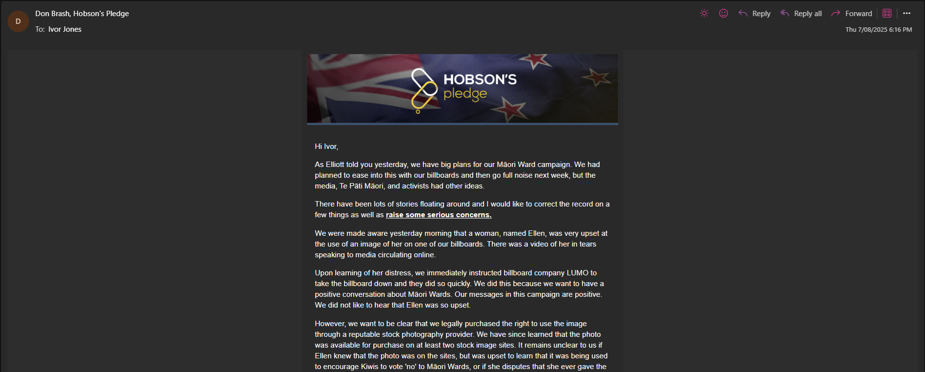 When confronted with Tamati's distress, Don Brash's response revealed the colonial mindset underlying Hobson's Pledge. Rather than immediately apologising, he claimed they would "endeavour to contact the woman concerned and offer our apologies". This grudging response came only after over 30 complaints flooded the Advertising Standards Authority within hours.rnz