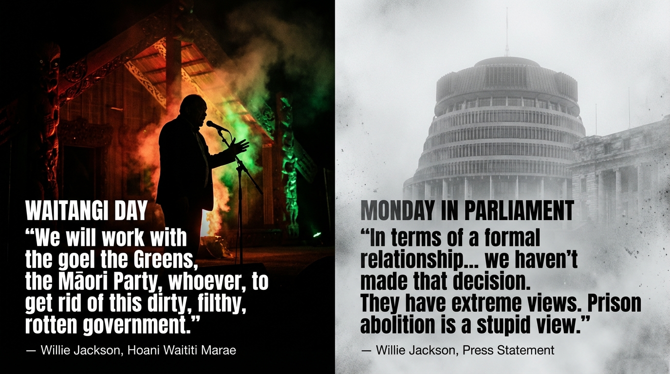 Picture this. Waitangi Day 2026. Hoani Waititi Marae, West Auckland. Willie Jackson strides onto the stage, flanked by Labour MPs, sharing the platform with Te Pāti Māori co-leader Rawiri Waititi. The crowd hums with anticipation. Jackson grabs the microphone and roars: