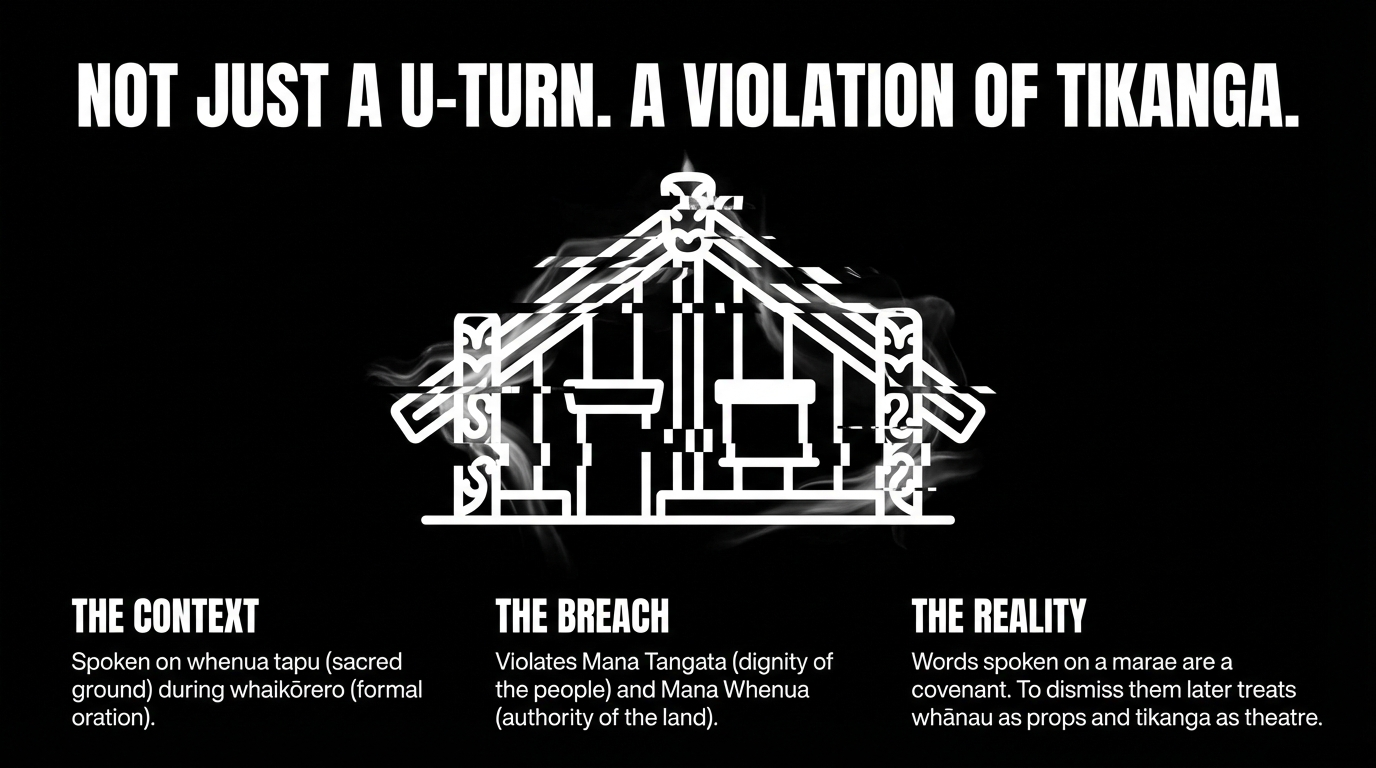 When you speak on a marae and your words are empty, you diminish not only yourself—you diminish the marae, the kawa, the tūpuna who consecrated that ground. You treat whānau as props. You treat tikanga as theatre. You reduce the sacred to the rhetorical.