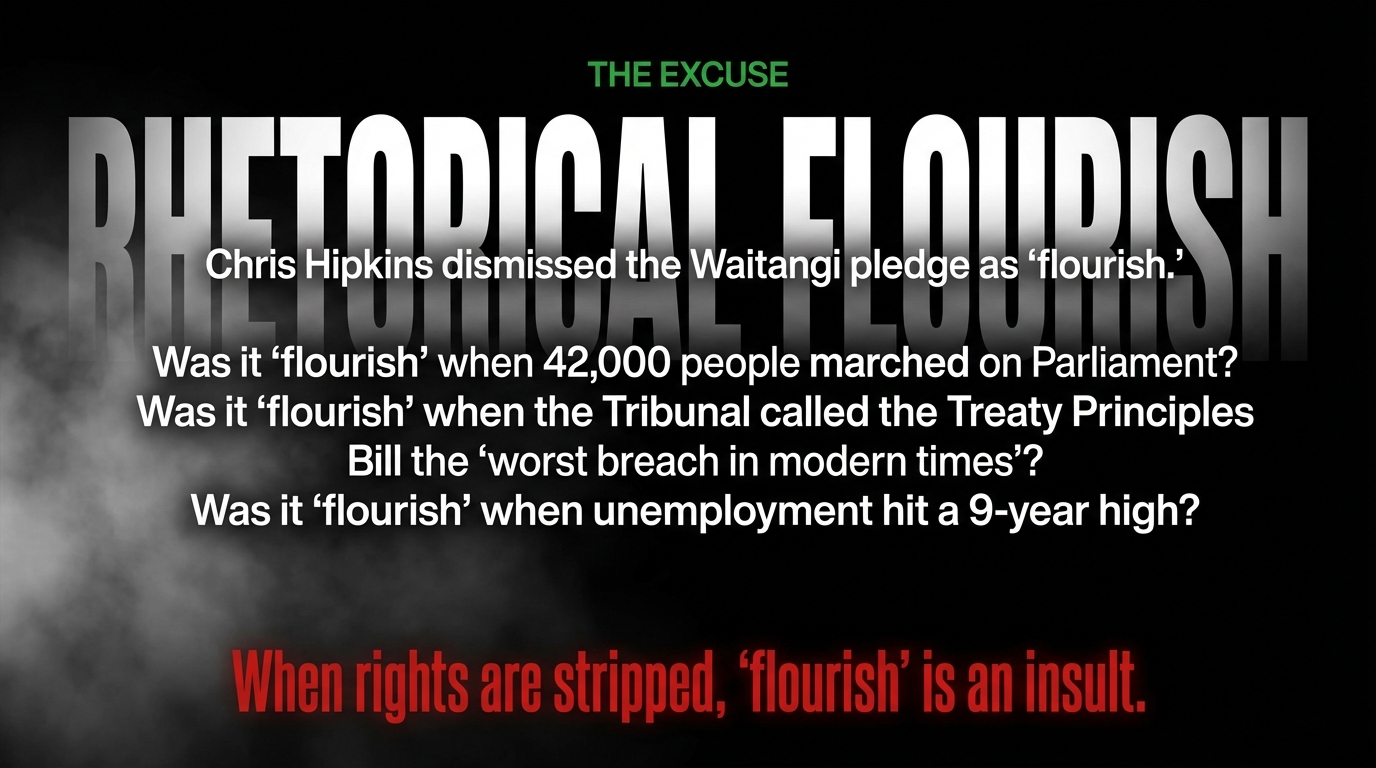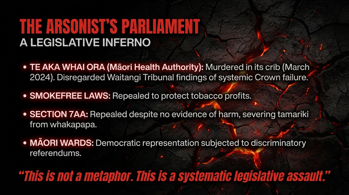 Before we dissect Jackson's performance, let us name the inferno he claims to oppose. Because this is not a metaphor. The National-ACT-NZ First coalition has assembled the most systematic legislative assault on Māori rights in modern Aotearoa.