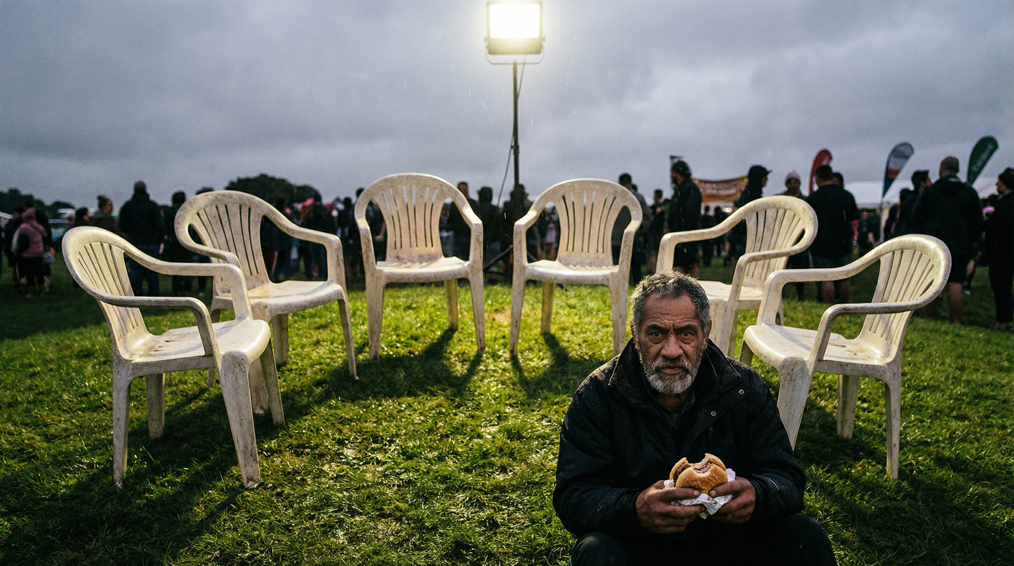 I took my pork-and-venison burger — sourced from the land, cooked by the community, sold for the coastguard — and sat down on the grass beside her. Not on a chair. On the whenua. Because that is where tangata whenua belong. On the ground. Connected. Grounded. While the politician floats above on plastic.