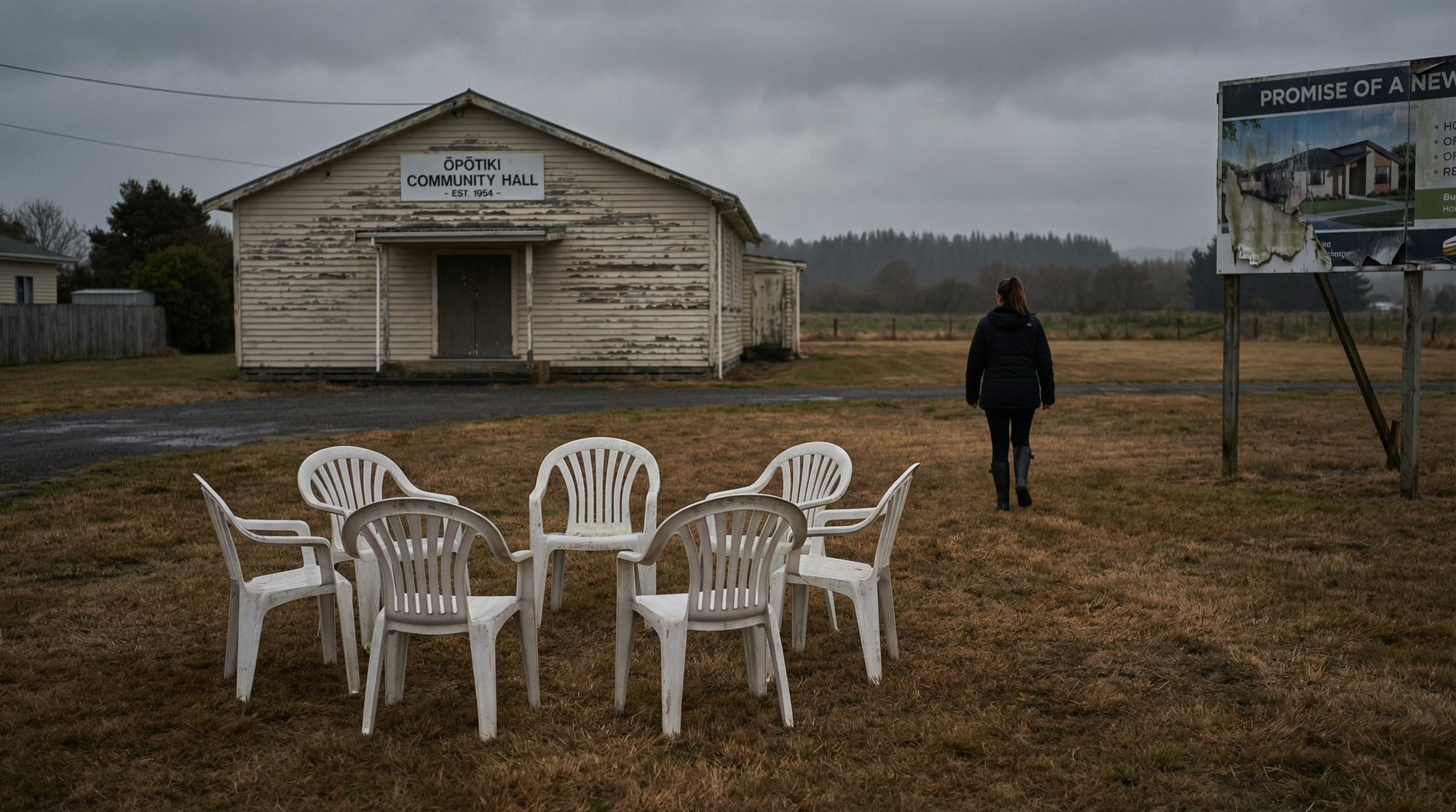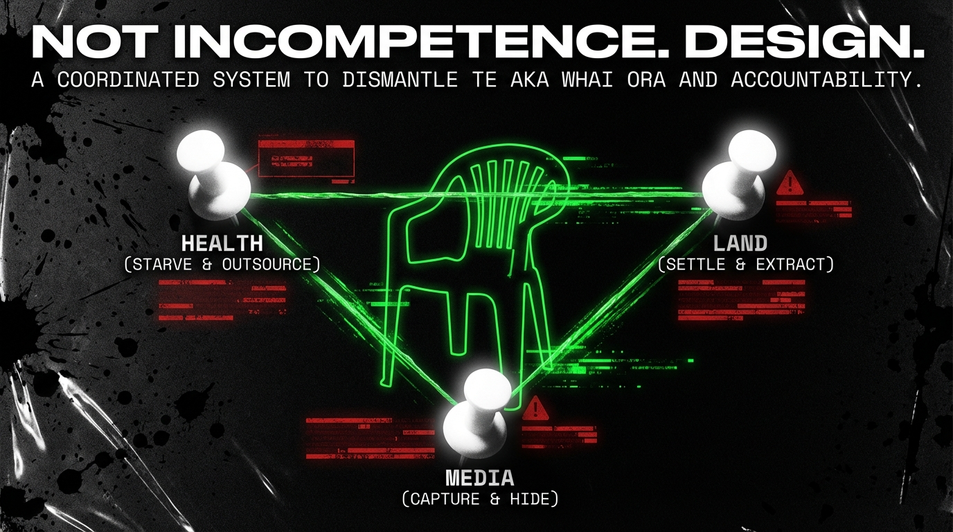 Connection 5: The circle of chairs is the circle of power. Dana Kirkpatrick sits on a plastic chair at a community fundraiser, surrounded by empty seats, performing constituency. But the real circle — the one that protects her from accountability — is the circle of Joyce at the Herald, Seymour pushing privatisation, Jones buying loyalty with marae millions, and a coalition government systematically dismantling every Māori institution, every public service, every mechanism of accountability that might challenge their project.