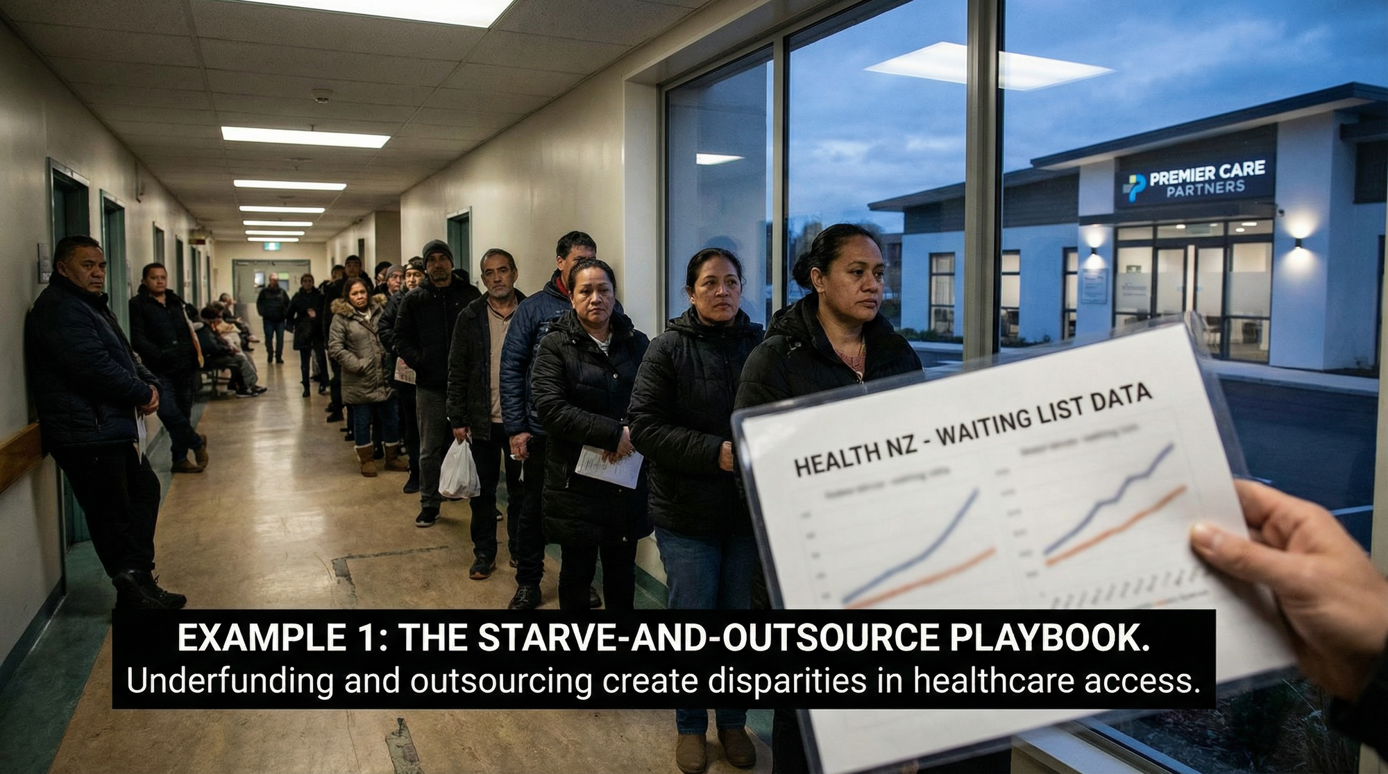 The solution: Fully fund the public health system. Reinstate the Māori Health Authority (Te Aka Whai Ora). End long-term outsourcing contracts that permanently redirect public money to private profit. Standardise access thresholds nationally so no patient is denied care based on where they live.