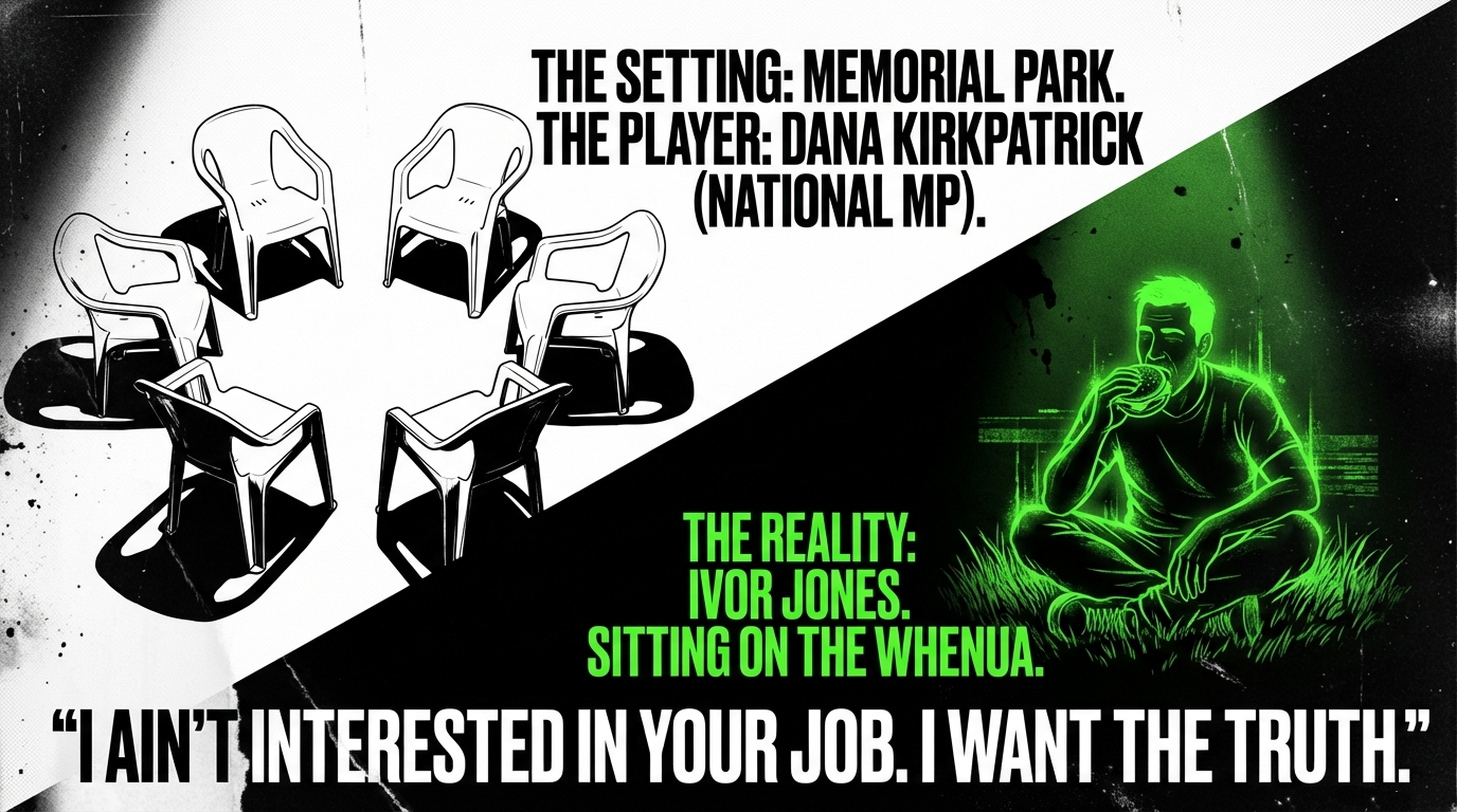 When the people sit on the grass and the politician sits on a plastic throne, you already know who is closer to the whenua — and who is closer to the exit.