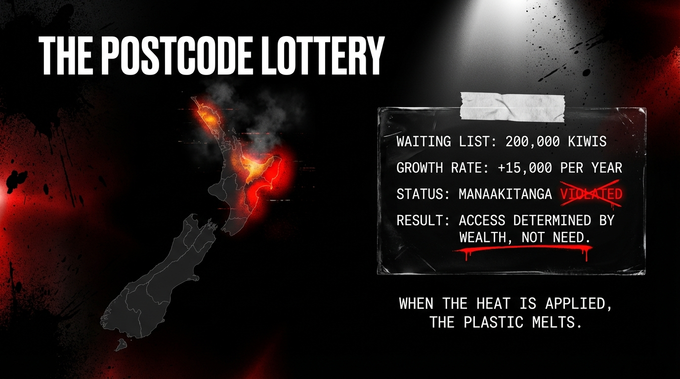 The tikanga violation: In te ao Māori, manaakitanga demands that care is provided based on need, not ability to pay or proximity to a private hospital. The concept of rationing care by postcode — making some whānau wait longer simply because they live in the wrong town — is the antithesis of collective responsibility. It severs the principle of kotahitanga (unity) by creating tiers of citizenship: those who can afford private insurance, and those who cannot. This government is building a health system where your whakapapa determines whether you live or die — not because of genetics, but because of geography and poverty.