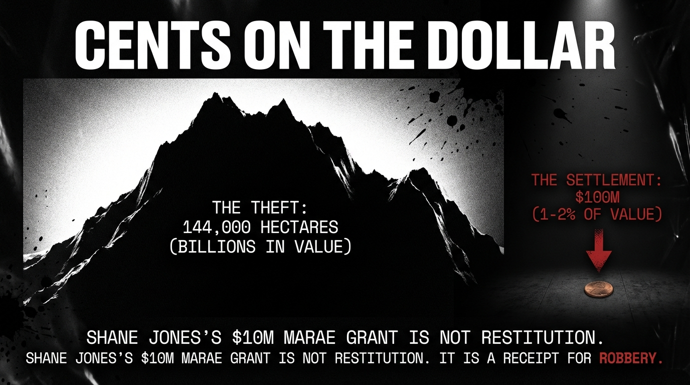 Connection 2: Treaty settlements fund the illusion of reconciliation while wealth extraction continues. Te Whakatōhea received $100 million for 144,000 hectares. The kiwifruit and dairy industries operating on that stolen land generate billions annually. The settlement is a receipt, not restitution. And when Shane Jones throws $10 million at a marae rebuild, it is a political gesture — his own colleagues admitted it at Rātana — not structural repair.