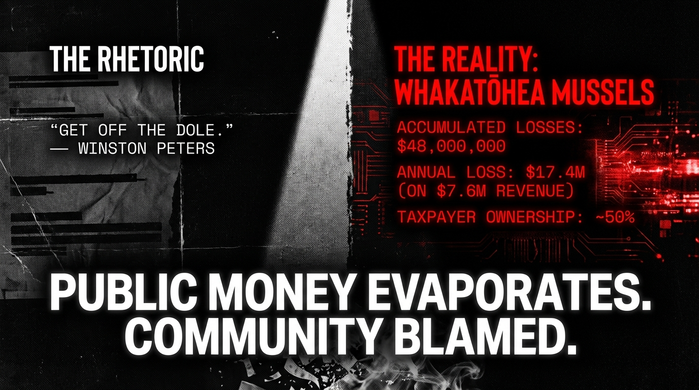 Connection 3: The Ōpōtiki mussels serve the Crown's narrative, not the community's needs. Over $48 million in losses while the Crown increases its shareholding. This is not economic empowerment for Whakatōhea — it is a Crown-controlled enterprise wearing an iwi mask. Winston Peters lectures Ōpōtiki about getting off the dole while his government controls a company that loses more money than it makes.
