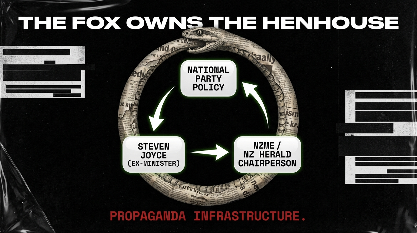Connection 4: Steven Joyce's capture of the Herald completes the propaganda cycle. The government privatises health, underfunds settlements, and throws money at failing ventures — and the country's largest newspaper, now chaired by a National Party stalwart, ensures the questions never get asked. Joyce told shareholders he would bring "fresh eyes" to editorial operations. Fresh eyes belong to someone who has never looked through the lens of power. Joyce has been looking through that lens since 2008.