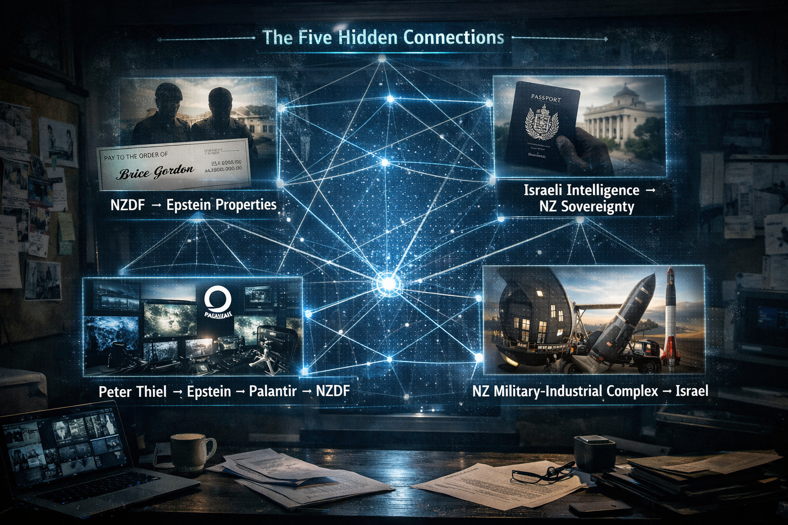 - Peter Thiel → Epstein → Palantir → NZDF: A confirmed Epstein associate co-founded the surveillance technology embedded in New Zealand's military, spy agencies, and SAS — granted citizenship under "exceptional circumstances" by a minister who said the public should be "proud."