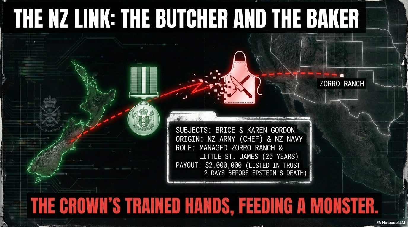 What happened: Two former NZDF members managed the operational infrastructure of a sex trafficking network for nearly twenty years. They were paid. They were trusted. They were given power of attorney. Two days before Epstein died, Brice Gordon was listed for US$2 million in the trafficker's trust.