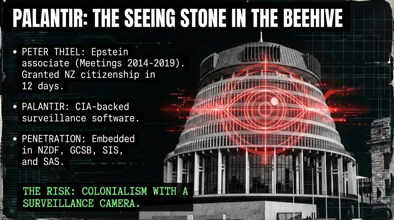 What happened: Peter Thiel — a confirmed Epstein associate — co-founded Palantir with CIA backing. New Zealand's military, SAS, GCSB, and SIS all purchased Palantir products. Thiel was granted citizenship under "exceptional circumstances" with only 12 days in the country. The government initially hid the Palantir contracts from the public.