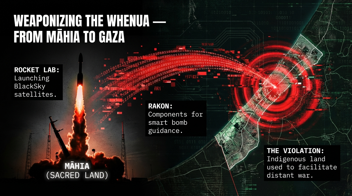 The tikanga violation: Whenua is not dirt. Whenua is the body of Papatūānuku — the Earth Mother. When rockets launch from Māhia carrying payloads that ultimately contribute to the targeting and killing of children, the mauri of that whenua is violated. The tangata whenua of Māhia did not consent to their ancestral land being used as a launch pad for military surveillance. This is not economic development. It is the colonisation of indigenous land for the military-industrial purposes of a foreign power. In tikanga, the harm to whenua is harm to whakapapa — the living genealogy that connects people to place, to ancestor, to future.