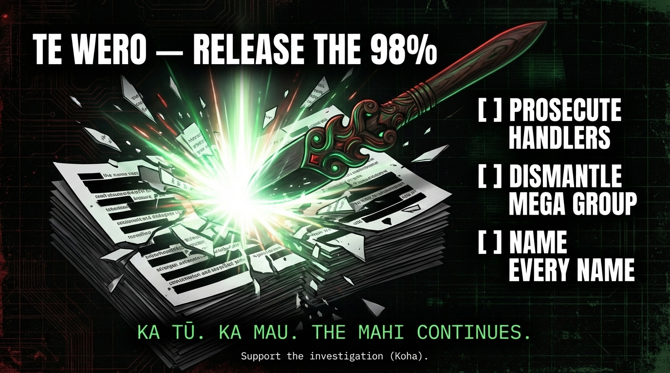 Every koha signals that whānau are ready to fund the investigations that Crown and corporate structures will not conduct. When a government refuses to ask why two of its own soldiers ran a sex trafficker's empire — when it hides Palantir contracts and approves spy satellite launches and extends military liaison to a genocidal state — your koha funds the accountability they will never provide.