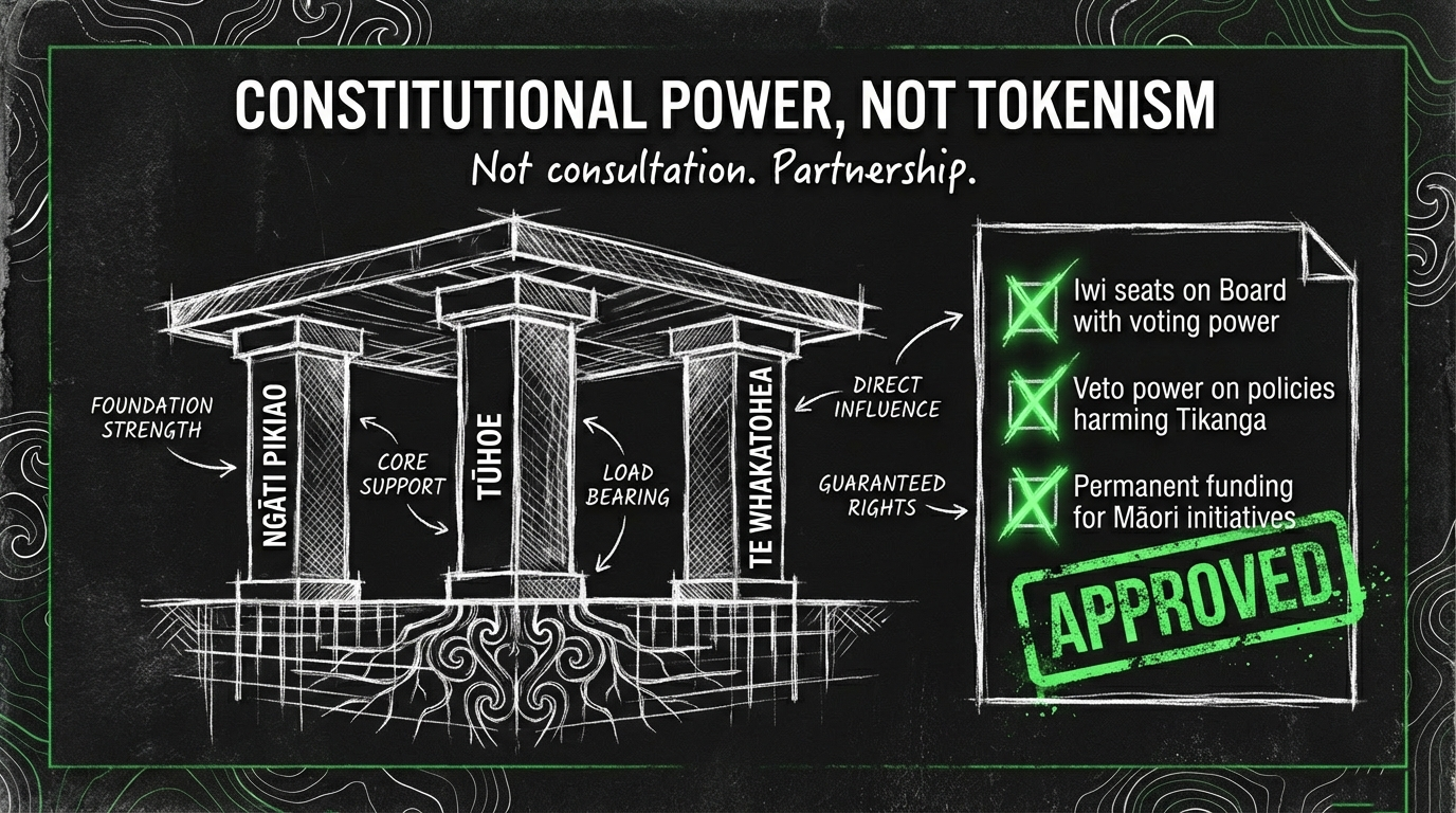 - Constitutional power for local iwi representatives on the Board, with entrenched decision-making authority on cultural matters, curriculum, and discipline.