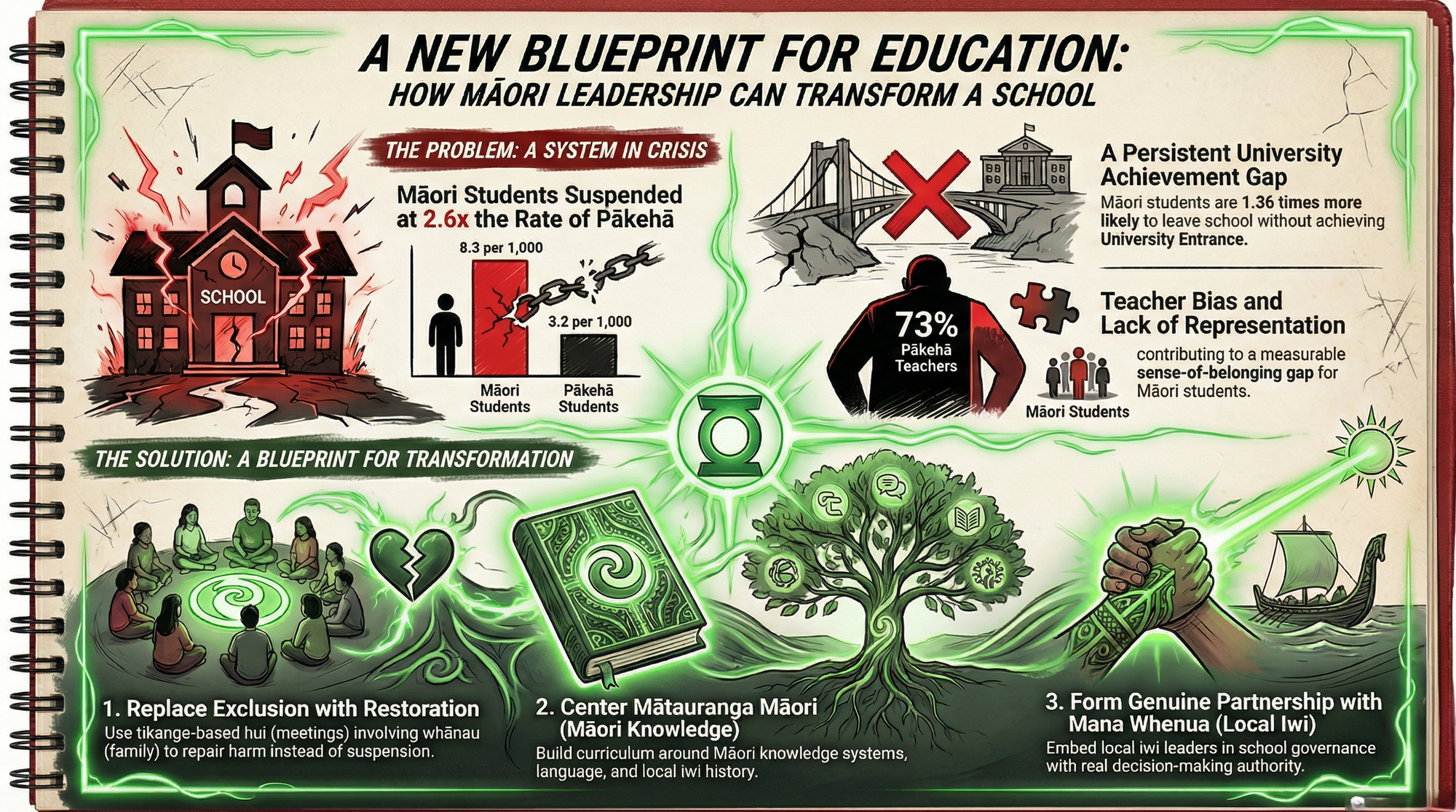 Schools that implement restorative justice approaches grounded in tikanga—such as Taita College, where whānau-centered restorative processes replaced exclusion, and Māori suspensions and exclusions dropped dramatically—demonstrate that the suspension statistics are not fixed. They are the outcome of institutional choices. And a Māori principal can make different choices.