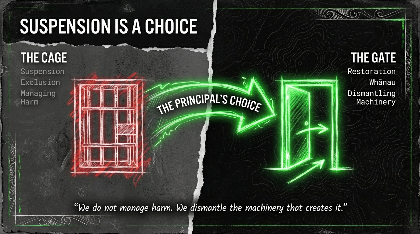suspension ends here. In its place comes hui, whānau engagement, collective accountability, and restoration. Stand-down rates of 25,167 in 2022—the highest in 20+ years—represent not inevitability but an opportunity to pioneer a different model.