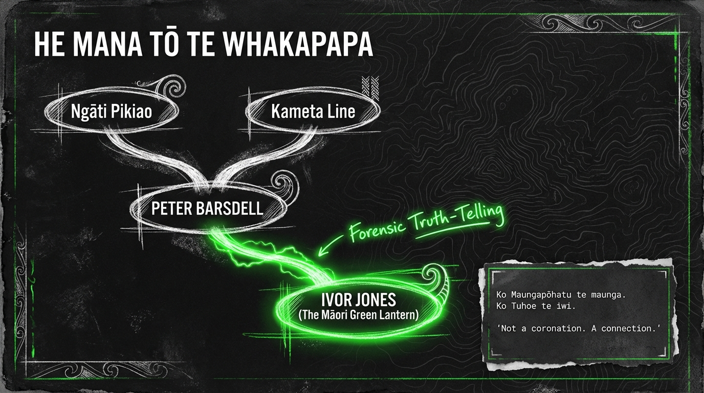 Peter Barsdel carries whakapapa through the Kameta line connecting to Ngāti Pikiao and the Whata genealogy. That same genealogy connects him to Ivor Jones, The Māori Green Lantern, whose forensic analysis of power, extraction, and dispossession has reached 42,000 people and reached position 79 globally in political influence within 24 hours of launch.