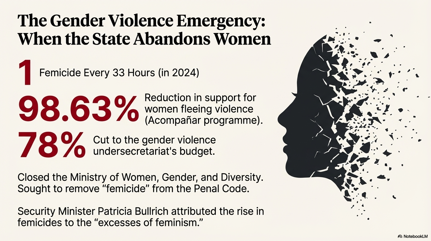 Argentina experienced one femicide every 33 hours in 2024. One woman murdered by a man every 33 hours. In response, Milei closed the Ministry of Women, Gender, and Diversity entirely, then shut down even the downgraded Undersecretariat for Protection Against Gender Violence in June 2024. The message was clear:
