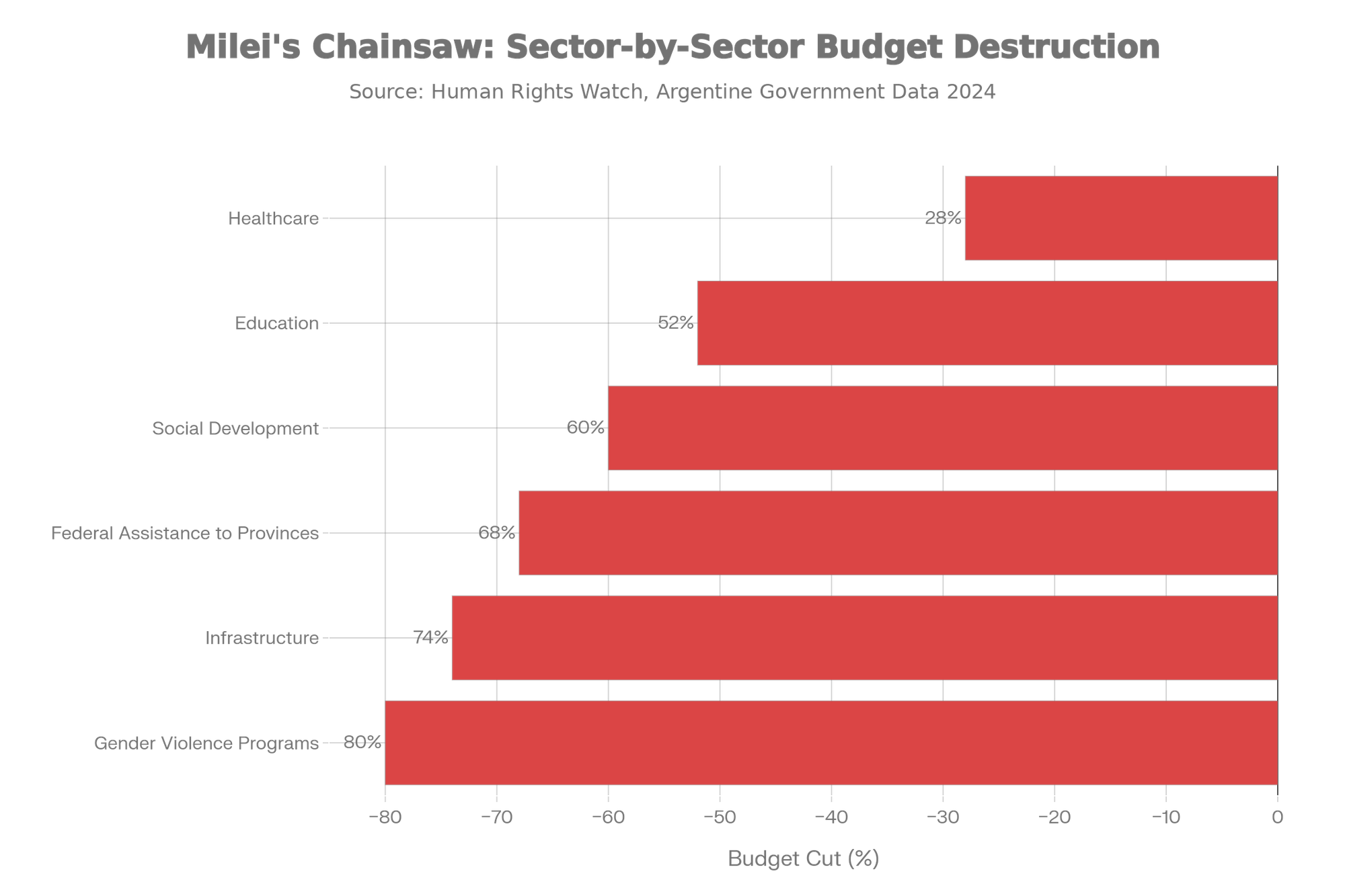 Milei’s Budget Cuts by Sector cuts tell the story of who pays the price for fiscal surpluses that make libertarian think tanks cream their jeans. Infrastructure spending fell 74%, social development 60%, education 52%, healthcare 28%, and federal assistance to provinces 68%. These are not merely numbers on a spreadsheet. They represent suspended cancer screening programs, frozen immunization campaigns that led to Argentina’s first measles death in two decades, prescription medication prices that spiked 250%, and the dismantling of the National Directorate for HIV, Hepatitis and Tuberculosis.