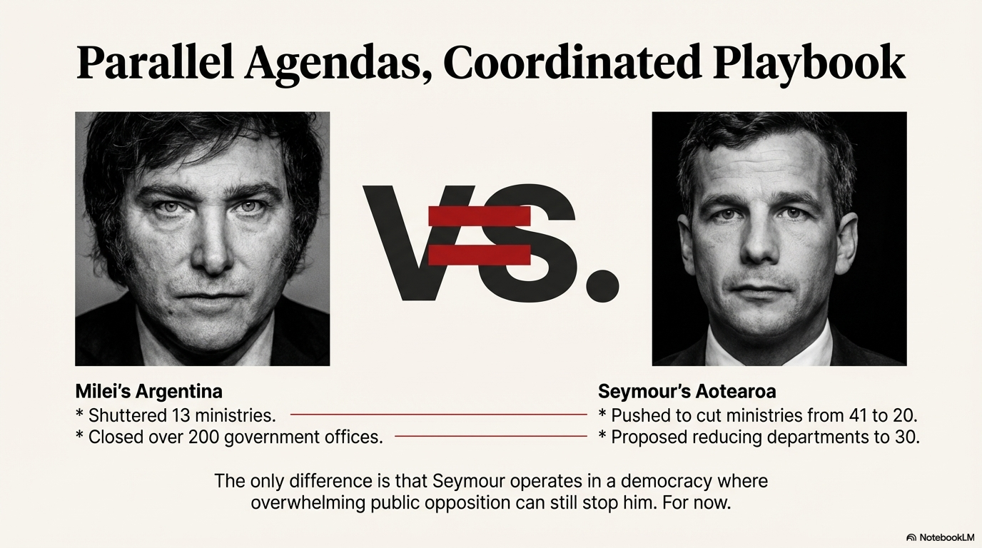 Seymour vs Milei Policy Comparison not coincidental. They are coordinated. Seymour and Milei are nodes in the same transnational network—trained by the same think tanks, funded by the same oligarchs, implementing the same playbook. The only difference is that Seymour operates in a democracy where overwhelming public opposition can still stop him. For now.
