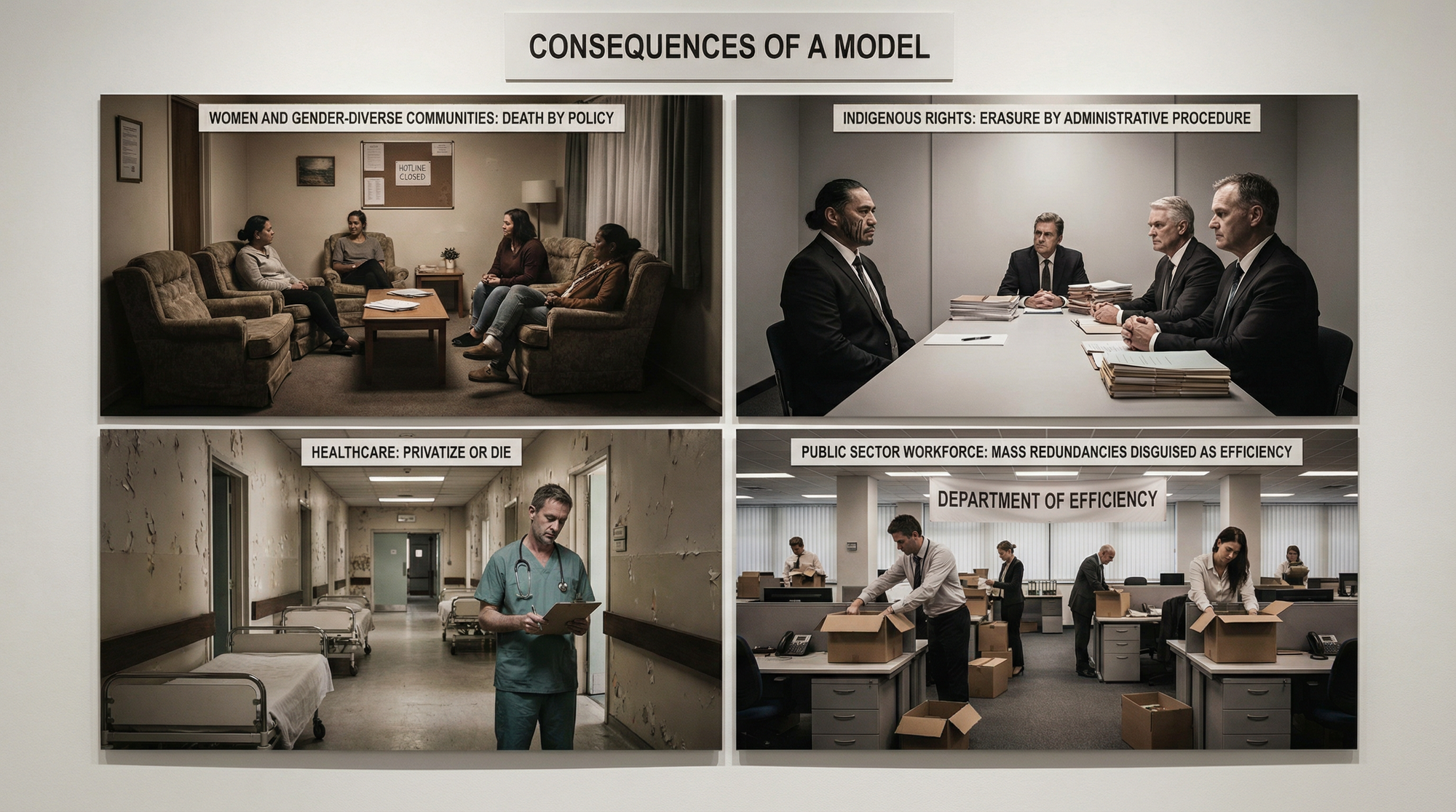 A fiscal surplus achieved by slashing healthcare 48% and cutting gender violence programs 89% is not success. It is theft from the vulnerable to pay the wealthy. It is mauri-depletion quantified and celebrated. It is the reduction of complex social relationships to a single number on a balance sheet, as if human suffering could be offset by fiscal discipline.