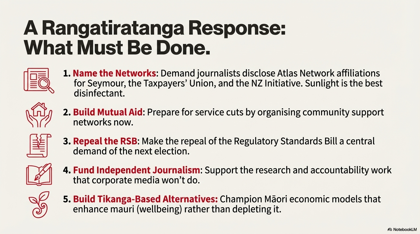 Every time Seymour, the NZ Taxpayers’ Union, or NZ Initiative make a policy proposal, journalists must disclose their Atlas Network affiliations. Write to editors. Call out reporters on social media. Make it socially unacceptable to quote these organizations without disclosing their funding and ideological commitments. Transparency disrupts coordination. Sunlight is the best disinfectant. Force them to operate in the open.