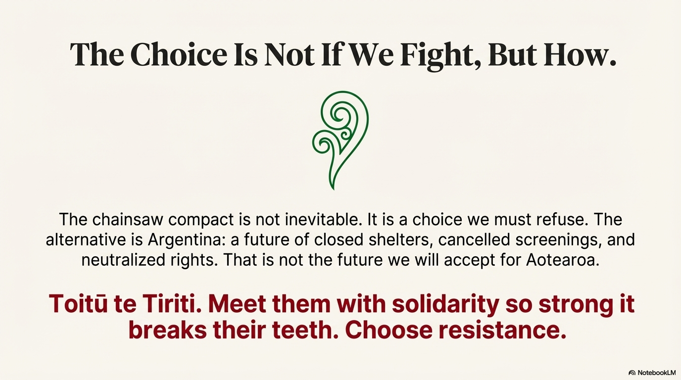 The chainsaw compact poses an existential threat to Te Tiriti, to social protections, to the democratic principle that government exists to serve the people rather than facilitate their extraction. But despair is not an option. Passivity is not an option. Resignation is exactly what these bastards want—they count on our exhaustion, our cynicism, our belief that resistance is futile.