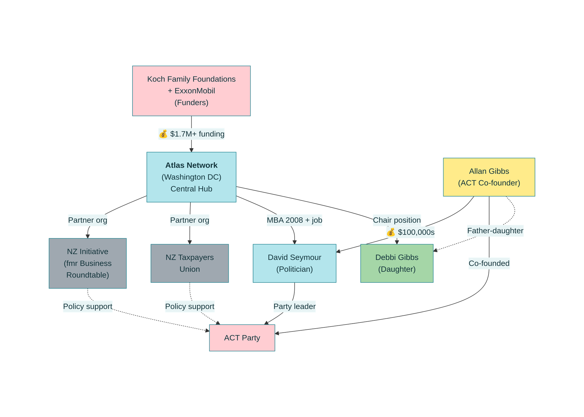 Read that sentence again. Allan Gibbs founded ACT. His daughter chairs the global Atlas Network. The family donates hundreds of thousands to ACT. David Seymour leads ACT. This is not six degrees of separation. This is zero degrees. This is a family business dressed up as a political party.