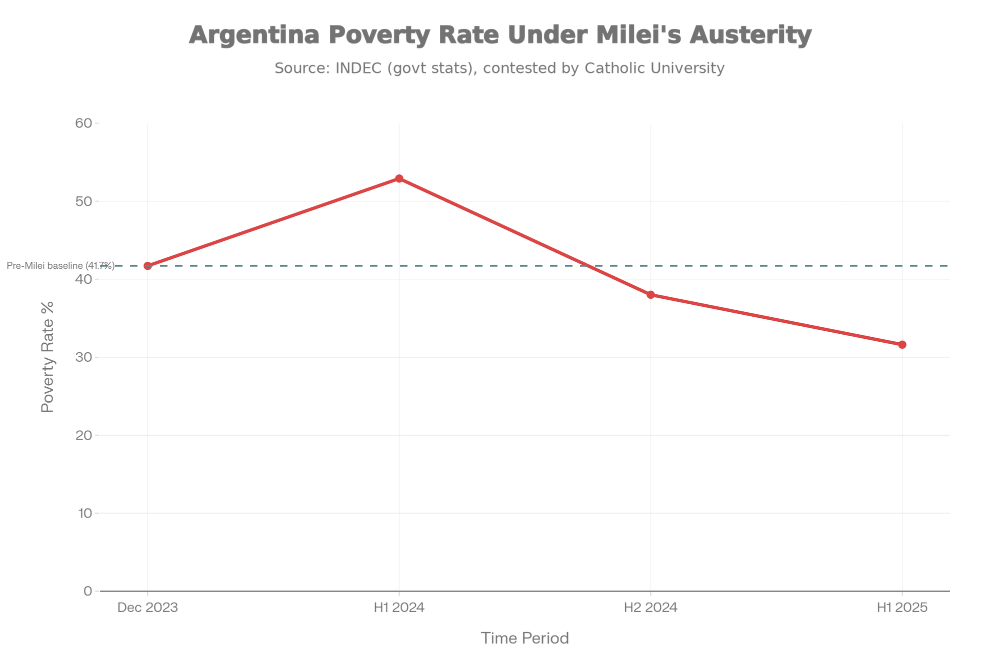 Poverty in Argentina stood at 41.7% when Milei took office in December 2023. It surged to 52.9% in the first half of 2024—over 24 million Argentines plunged into poverty—as austerity and inflation devastated household incomes. By mid-2025, government statistics (INDEC) claimed poverty had fallen to 31.6%, a figure Milei’s government celebrates as proof of success.