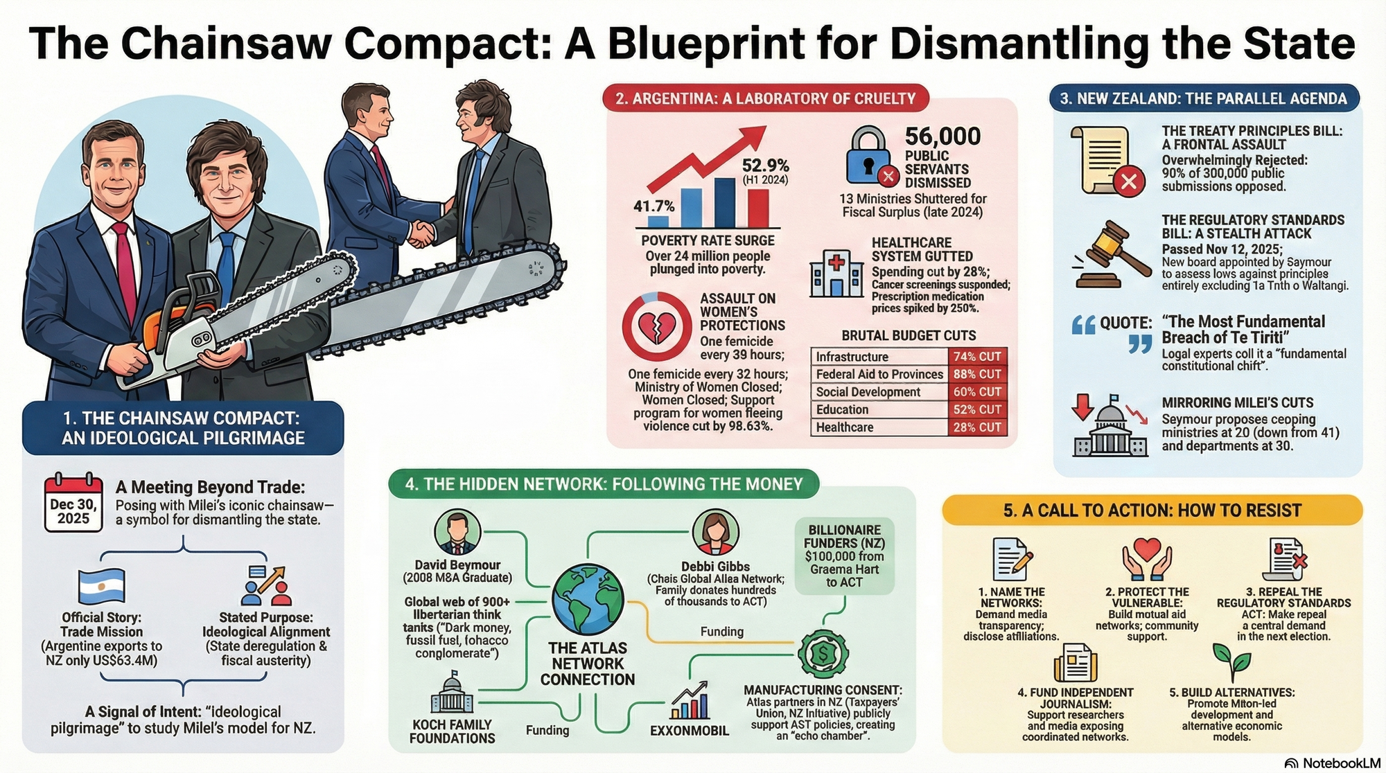 The chainsaw photo is a family photo—three generations of libertarian organizing made flesh. Allan Gibbs founded ACT to wage class war in New Zealand. Debbi Gibbs coordinates global libertarian networks from Washington. David Seymour implements their agenda as Deputy Prime Minister. And Javier Milei provides the proof of concept—Argentina as laboratory, New Zealand as next experiment.