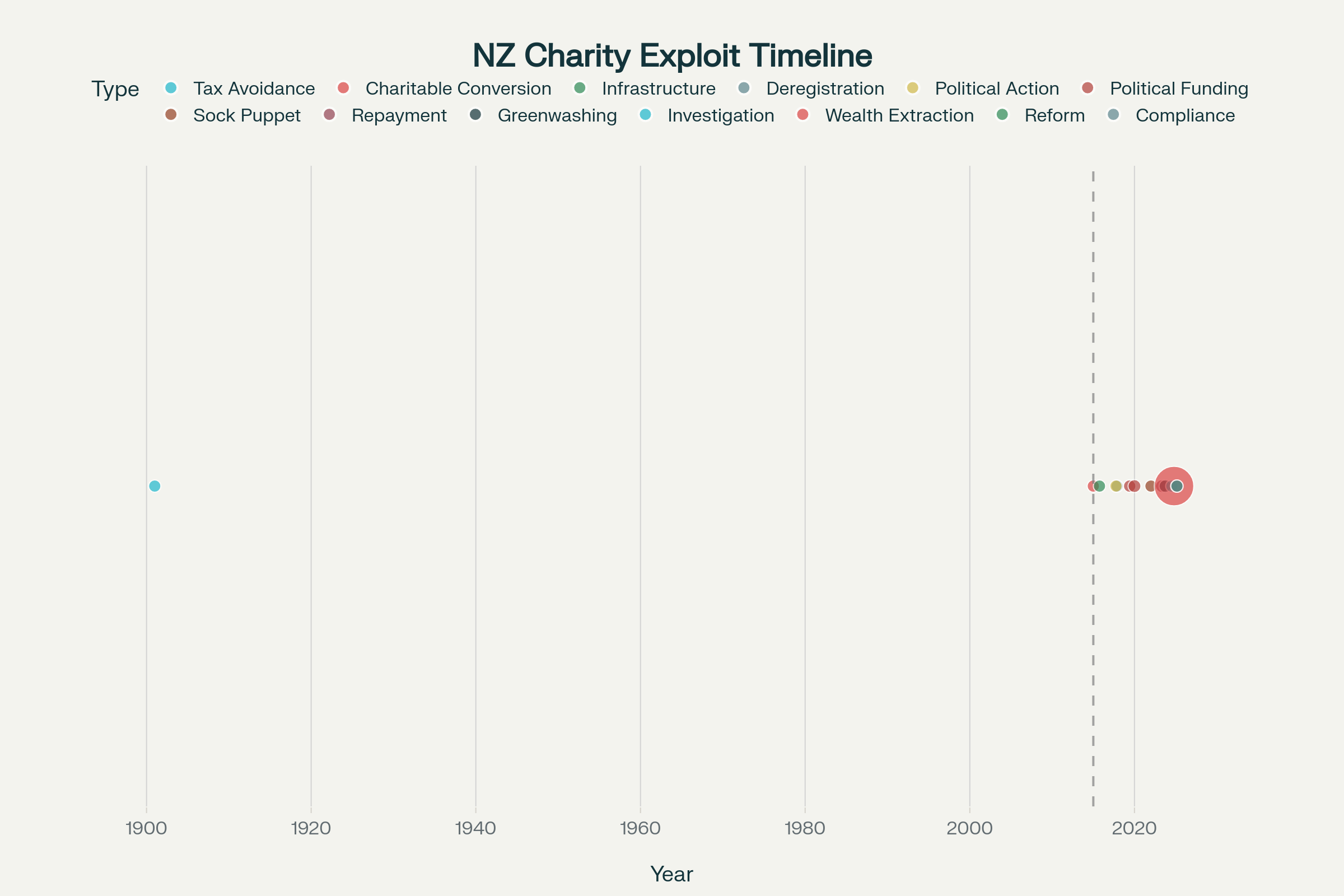 This exposé reveals how New Zealand's charity sector has been systematically corrupted by wealthy elites who exploit tax exemptions designed to support genuine community care. The timeline above demonstrates an alarming escalation of charity exploitation since 2015, revealing coordinated attacks on public resources that violate every principle of manaakitanga and collective wellbeing our tūpuna established.