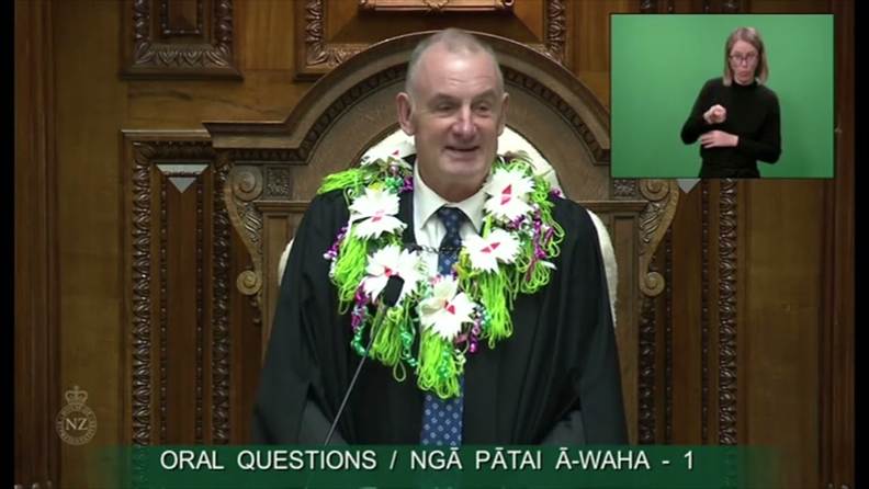 A New Zealand Parliament session showing a speaker adorned with traditional garland during oral questions, with sign language interpretation inset.