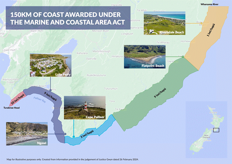 Map showing 150 km of New Zealand coastline awarded under the Marine and Coastal Area Act, highlighting iwi/hapū territories and key coastal locations.