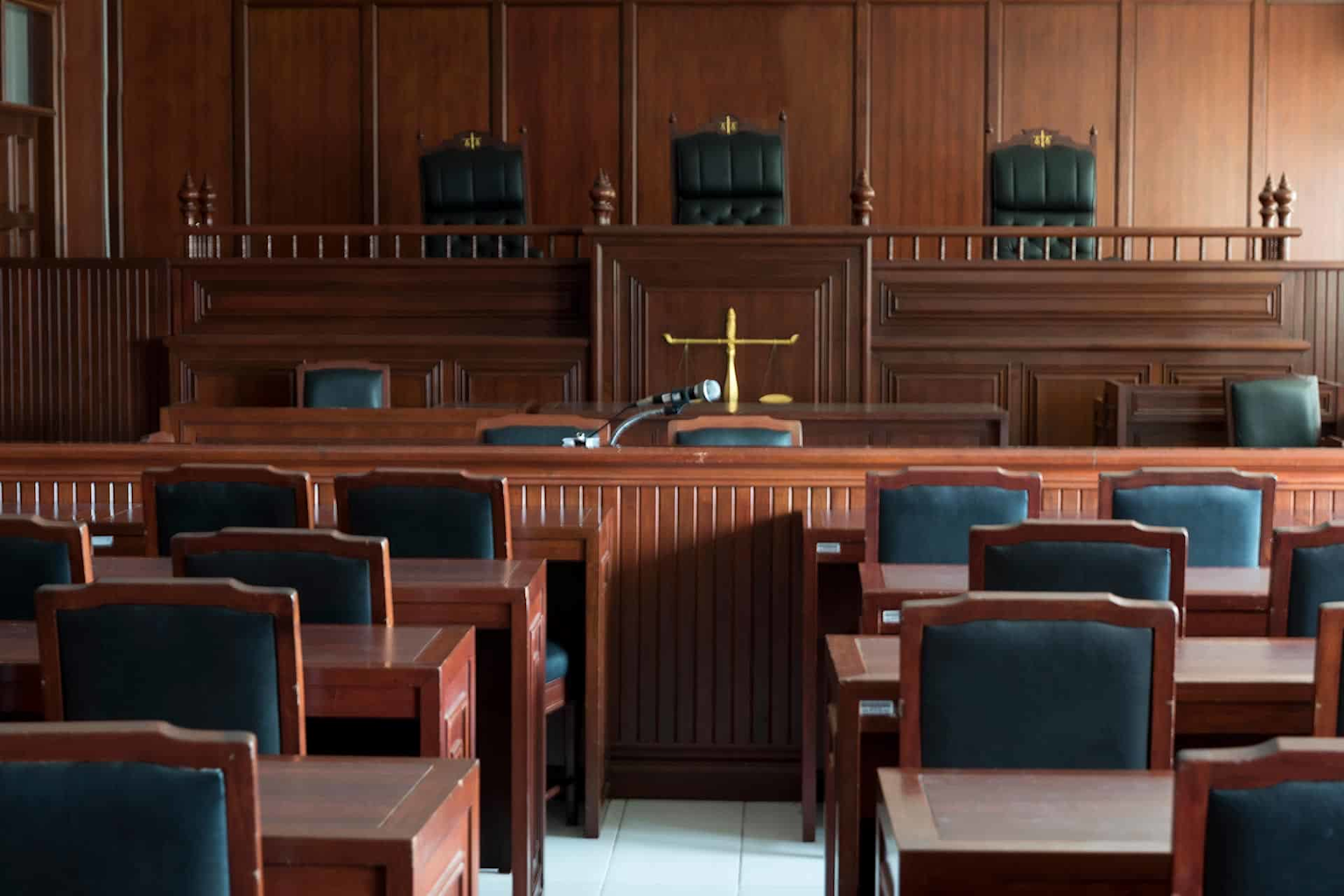Interior view of a New Zealand courtroom showing the judge’s bench, witness stand, and seating area