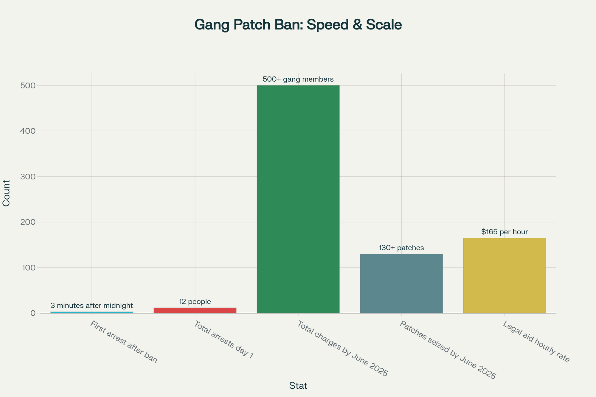 The gang patch ban was never primarily about public safety. It was designed as a weapon to criminalize Māori and test how far the courts would go in recognizing tikanga rights. The statistics reveal the true intent: within three minutes of the law taking effect, police made their first arrest. By day one, 12 people were charged. By June 2025, over 500 gang members faced charges and 130+ patches were seized.