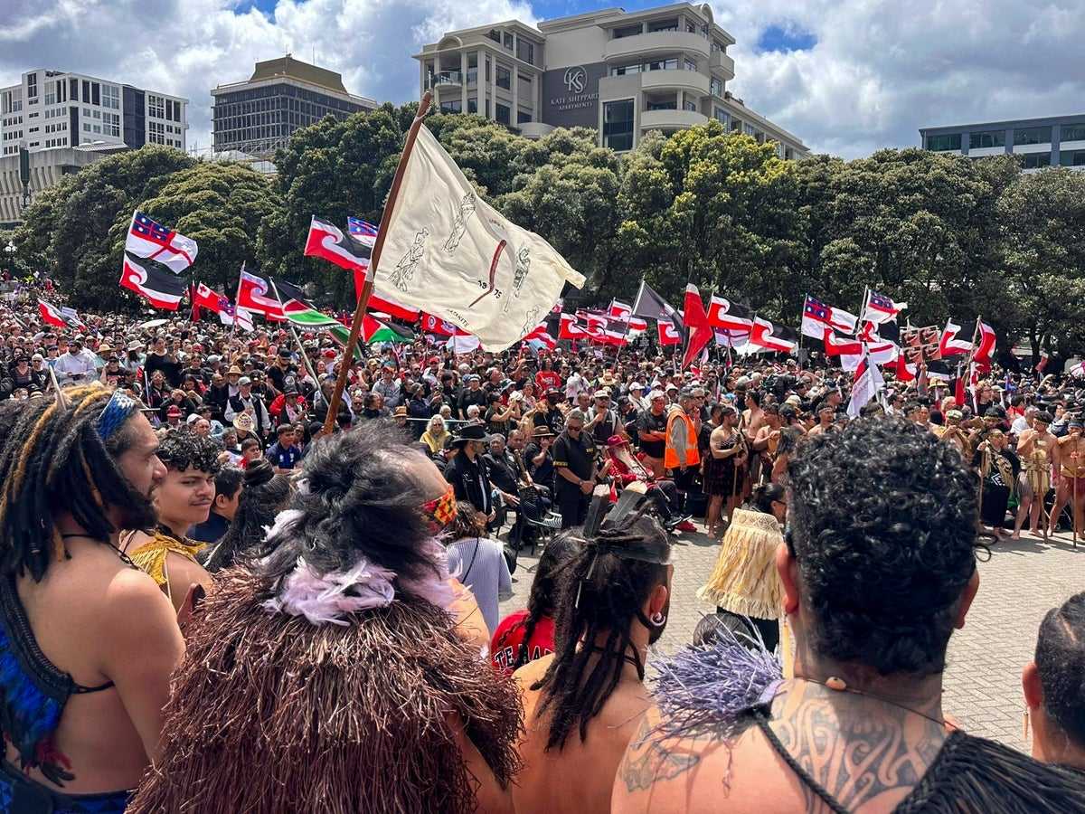 Māori protest crowd at Wellington parliament holding Tino Rangatiratanga flags and performing traditional haka