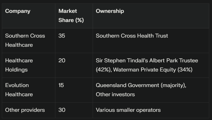 Let's follow the money. Southern Cross, the biggest player, was owned by the Southern Cross Health Trust. Evolution Healthcare, which owned Wakefield and Royston Hospitals, was majority owned by the Queensland government. Sir Stephen Tindall's Albert Park Trustee owned a 42 percent stake in Healthcare Holdings, with private equity firm Waterman owning 34 percent.