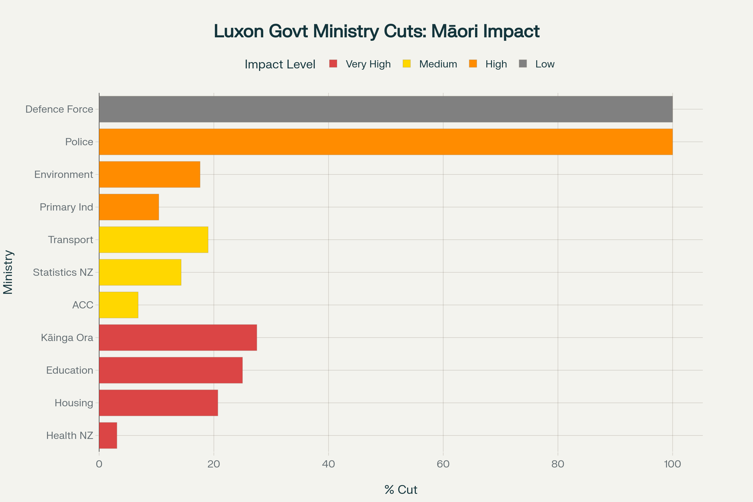 Percentage of jobs cut across New Zealand government ministries under Christopher Luxon's coalition government, color-coded by impact on Māori communities
