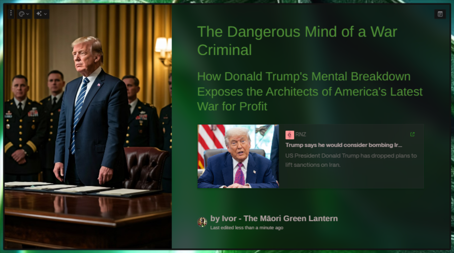 This cognitive deterioration becomes particularly dangerous when combined with access to nuclear weapons and military forces. The principle of kaitiakitanga - guardianship and protection - requires leaders to carefully consider the consequences of their actions for future generations. Trump's impulsive threats to bomb Iran show a complete disregard for these responsibilities.