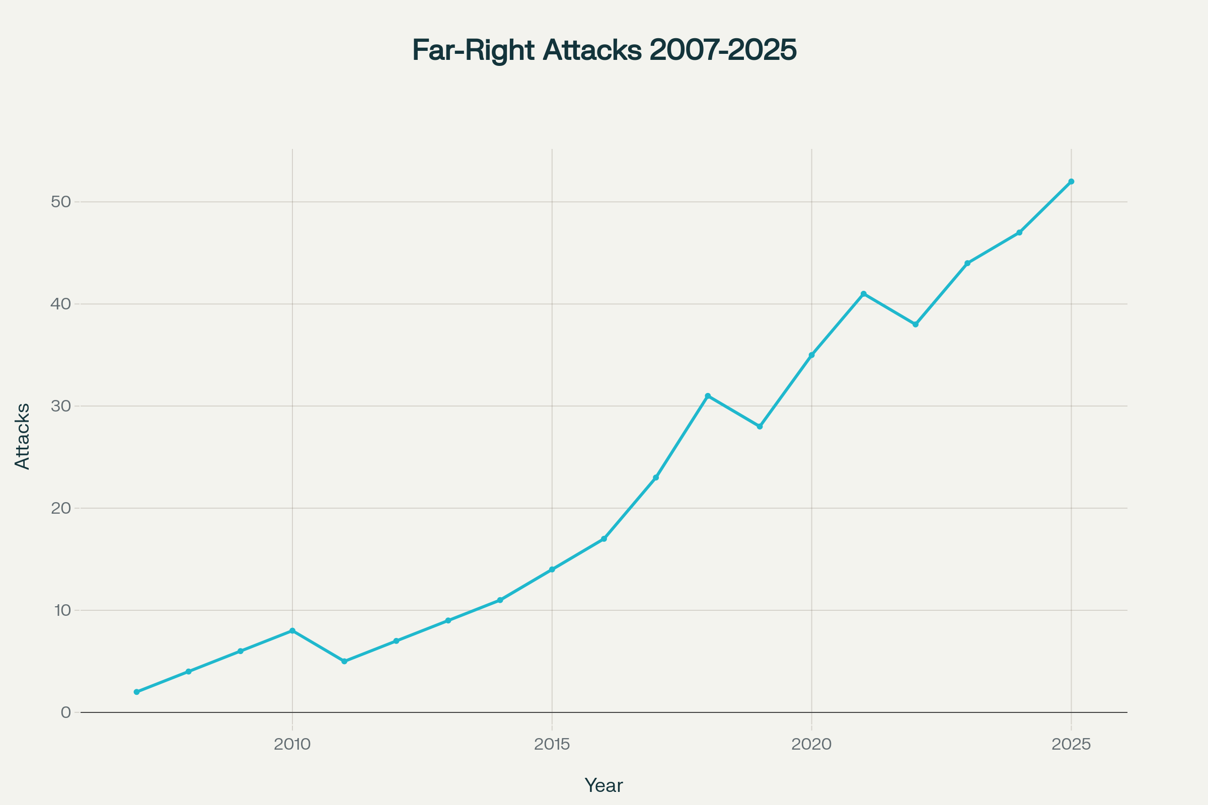 Documented increase in far-right extremist attacks showing acceleration during Trump era and beyond