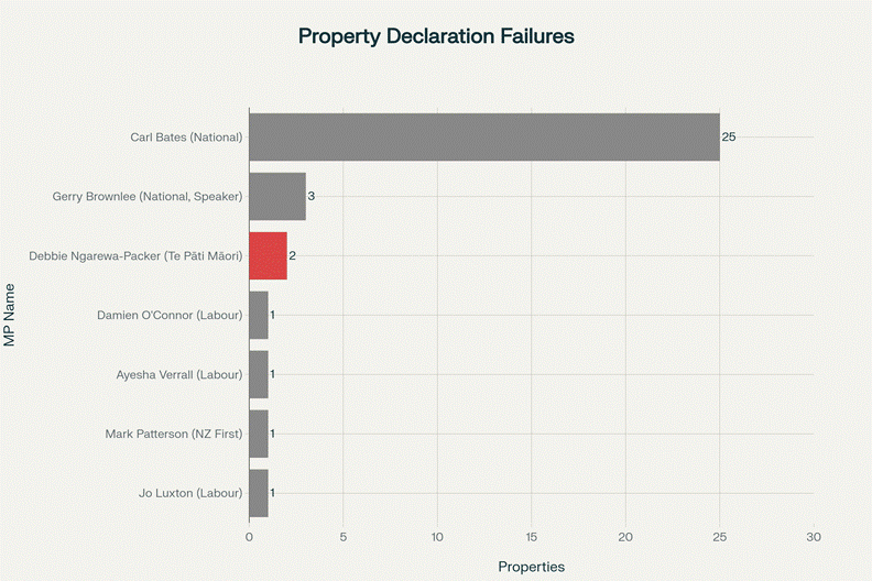 This chart reveals the stark disparity in media treatment: National MP Carl Bates with 25 undeclared properties received minimal coverage, while Te Pāti Māori co-leader Debbie Ngarewa-Packer with only 2 undeclared properties became a front-page headline story.