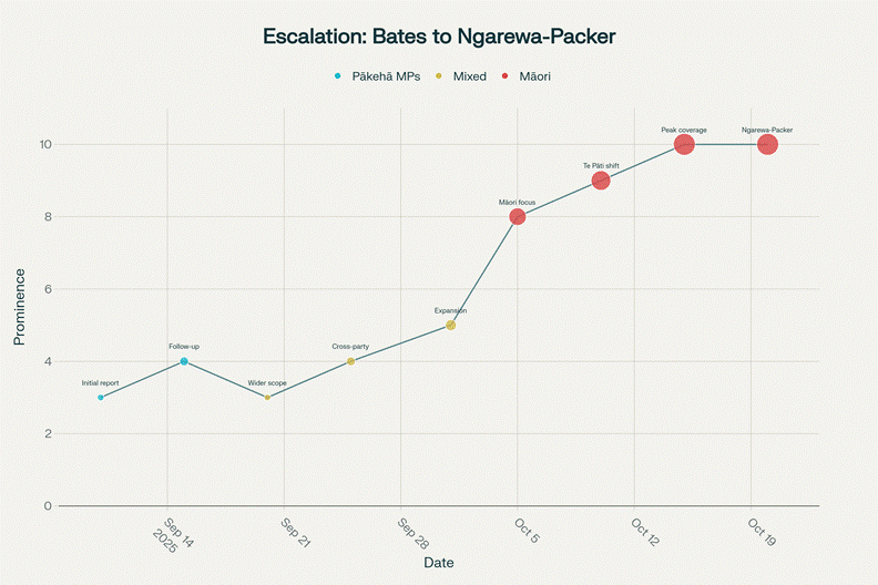 Consider the timeline. Bates story breaks September 10. Follow-up September 19. Six MPs contacted September 24. Inquiry into Bates announced September 26. General story about multiple MPs September 30. Then silence on Bates while the Herald stoked weeks of coverage about Te Pāti Māori “internal chaos” through mid-October. Then, October 20, Ngarewa-Packer gets the premium front-page treatment.[1][2][17][4][6]