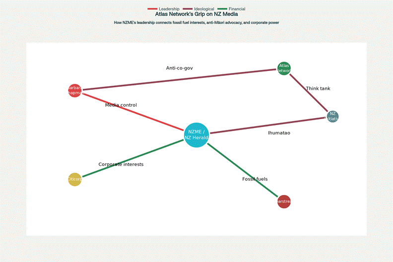 NZME Chair Barbara Chapman sits at the nexus of fossil fuel, corporate, and anti-Māori advocacy interests through her multiple directorships, while the company’s major shareholders have deep ties to mining and oil industries - exposing fundamental conflicts of interest in media coverage of Māori issues.