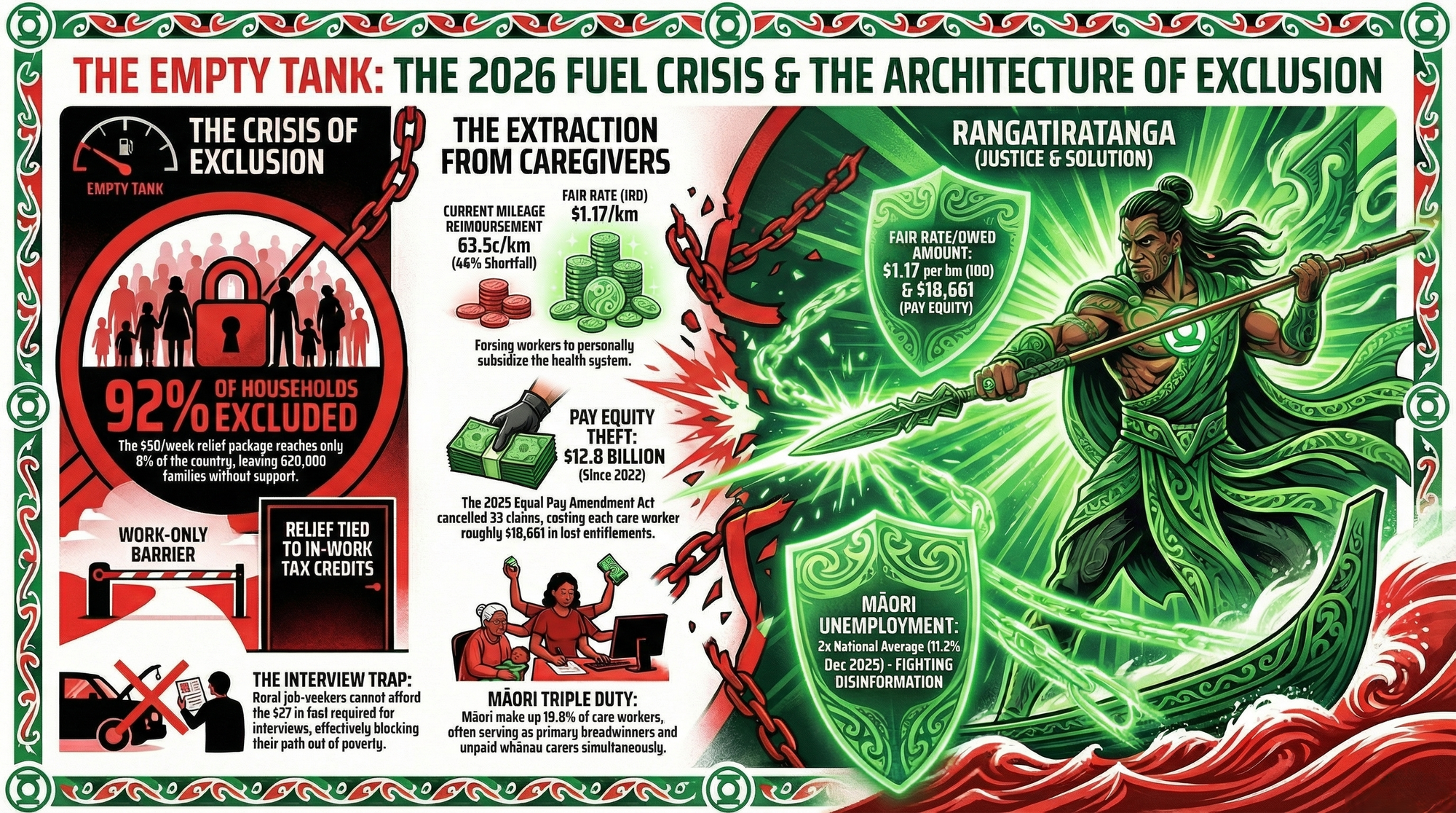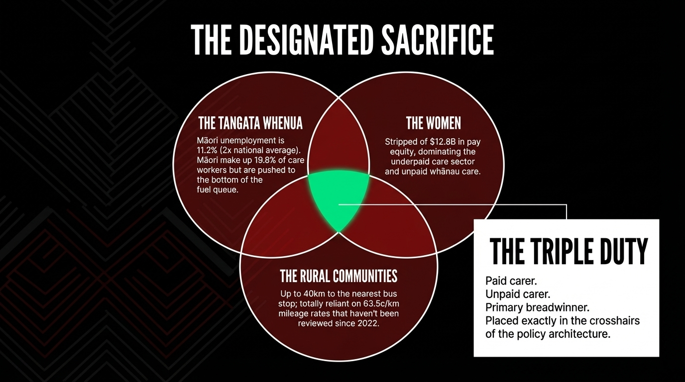 The people who would absorb the impact first, hardest, and longest were already identified: the same people always at the bottom of the queue. Māori whānau. Rural communities. Home and community support workers. Job-seekers on Jobseeker Support. People like the one in that RNZ headline — a human being who wants to care for their community and cannot afford the petrol to try.