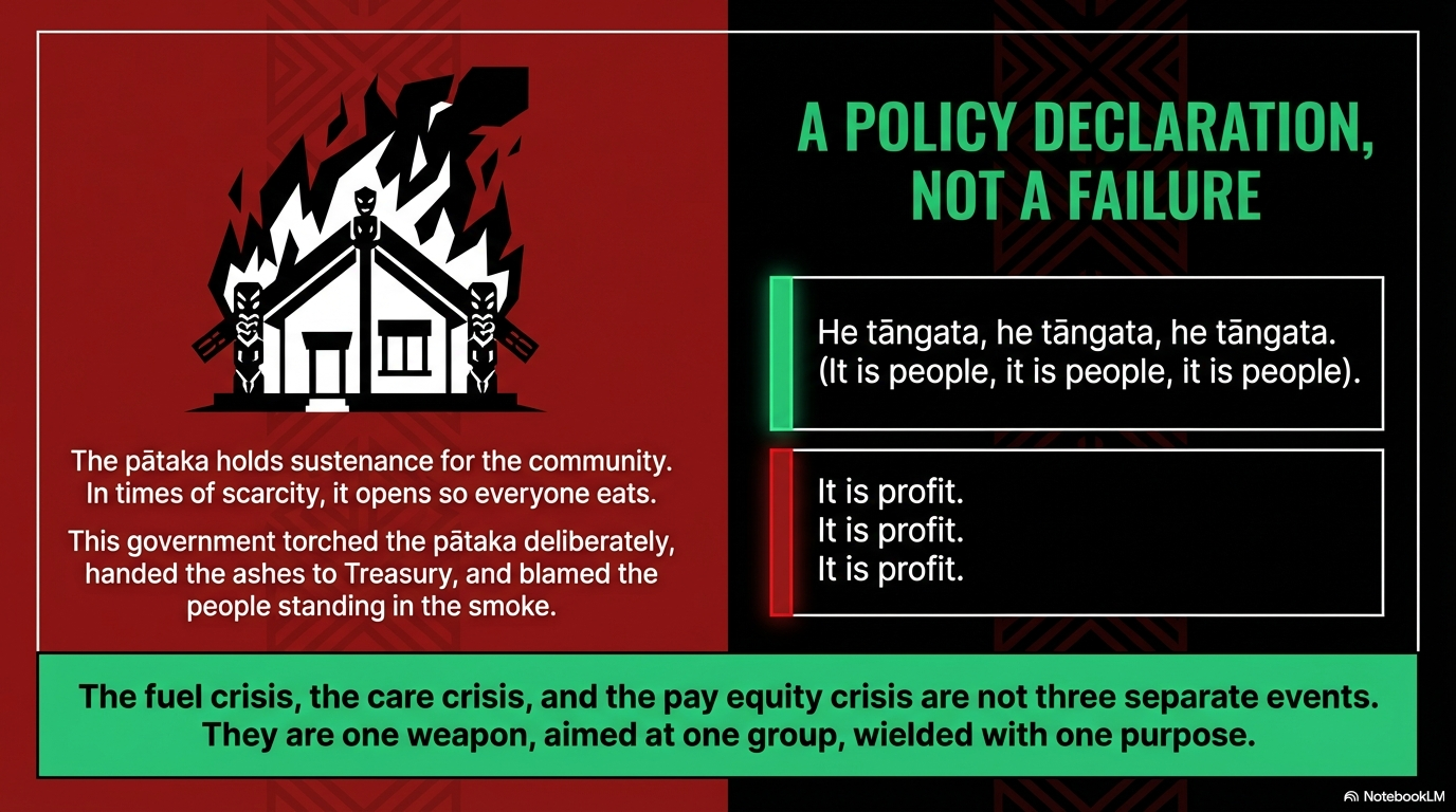 And as the Māori Green Lantern documented in "THE PĀTAKA IS ASH: How Nicola Willis and Christopher Luxon Poured Petrol on the Poor and Called It Relief" (25 March 2026), this is not a metaphor they stumbled into by chance — it is the consistent architecture of an ideological war on the poor.