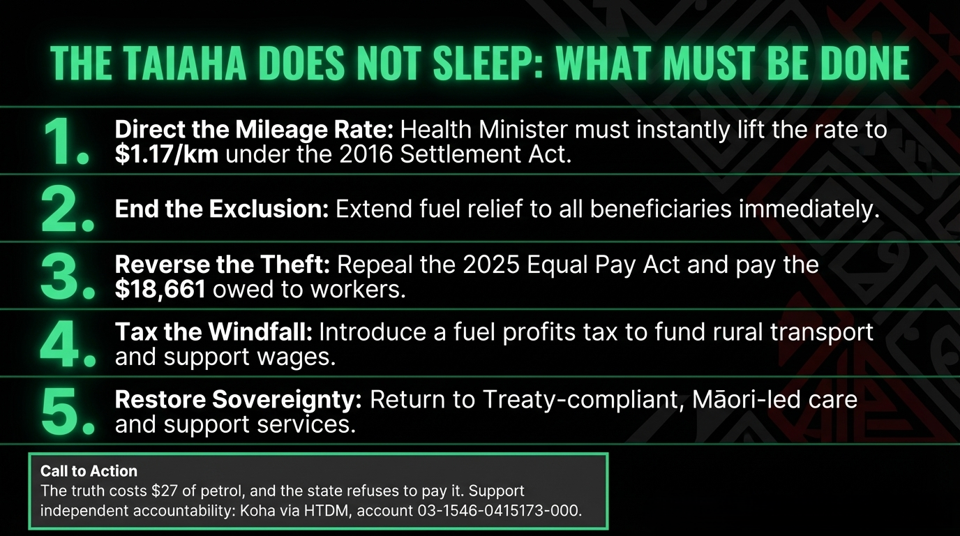 The solution: The Health Minister uses existing powers under the Home and Community Support (Payment for Travel Between Clients) Settlement Act 2016 to lift the rate to IRD Tier 1 immediately. No legislation. No review. No delay. Today, before the next worker drives another kilometre toward bankruptcy.