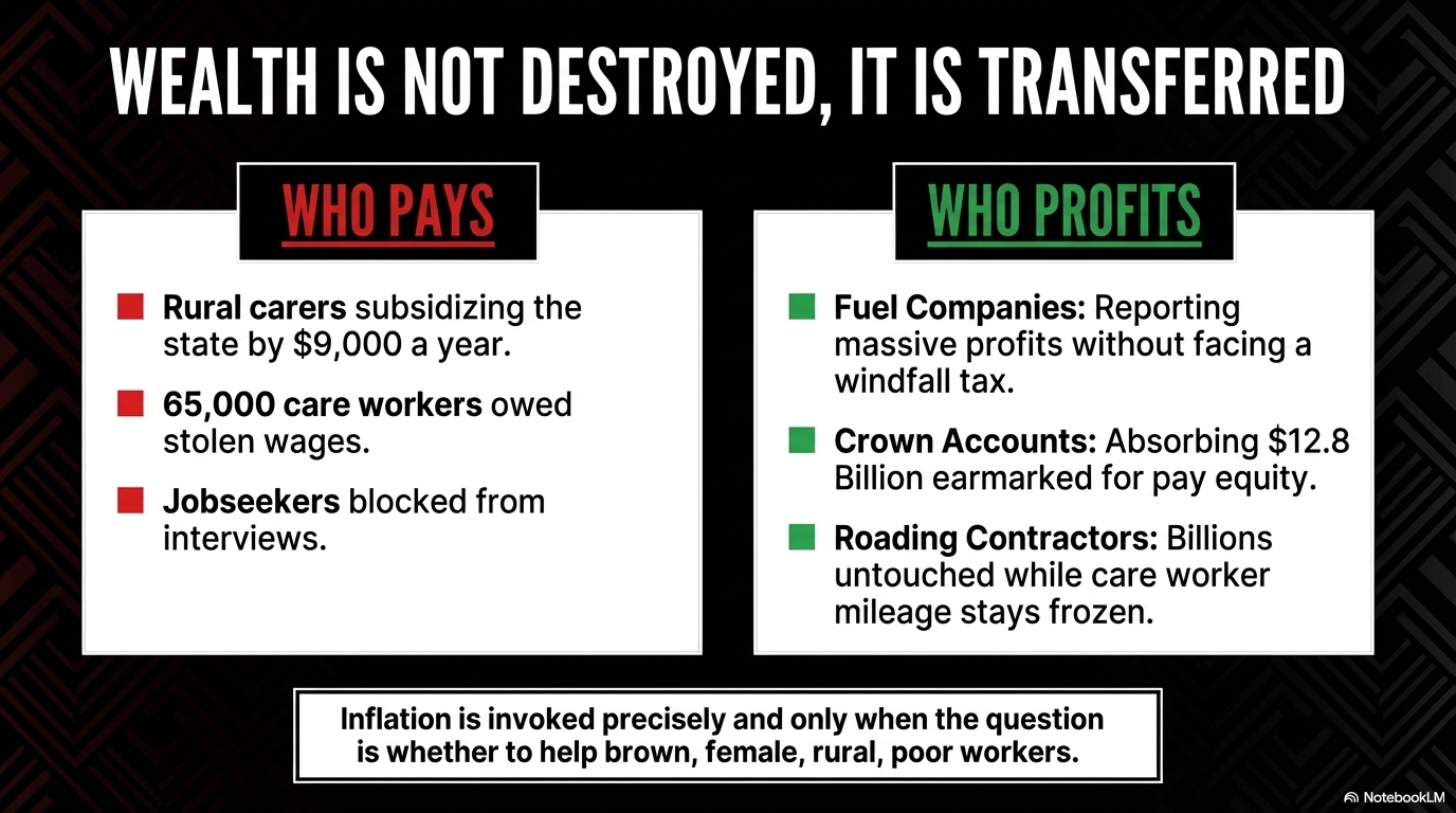 NZCCSS CEO Alicia Sudden named the central contradiction precisely: transport costs are a critical barrier for beneficiary families carrying out their obligations to seek work — the exact crisis faced by the rural carer in the RNZ headline. The government's response to that person? Structurally, deliberately: we do not see you.