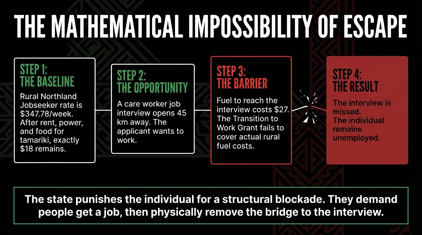 Work and Income has a Transition to Work Grant for exactly this situation. But at $3-plus per litre, the default transport allowance in the grant does not cover the actual cost of a rural return trip. You do not go. The interview goes ahead without you. The job goes to someone who can already afford to get there.